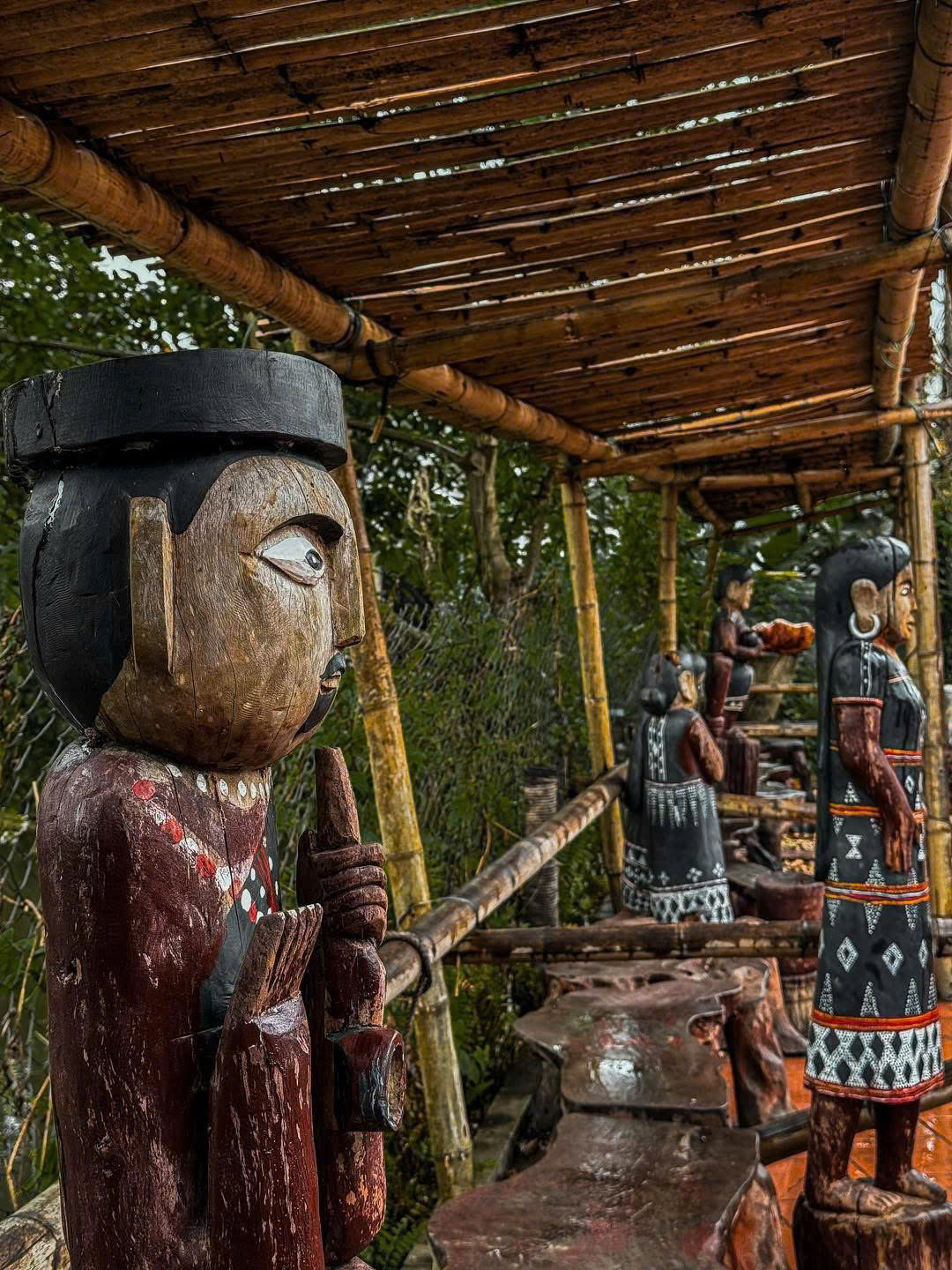 Những ngôi nhà sàn gỗ lợp mái tranh nằm san sát, phía trước là vườn rau, phía sau là bờ suối trong veo. Giữa làng, nhà Gươl – trung tâm sinh hoạt cộng đồng – nổi bật với những hoa văn chạm khắc tinh xảo, tượng gỗ người và thú được đặt quanh sân như canh giữ bình yên cho bản. Khói bếp tỏa nghi ngút, tiếng chày giã gạo, tiếng trẻ con cười đùa – tất cả tạo nên âm thanh ấm áp của cuộc sống miền sơn cước.